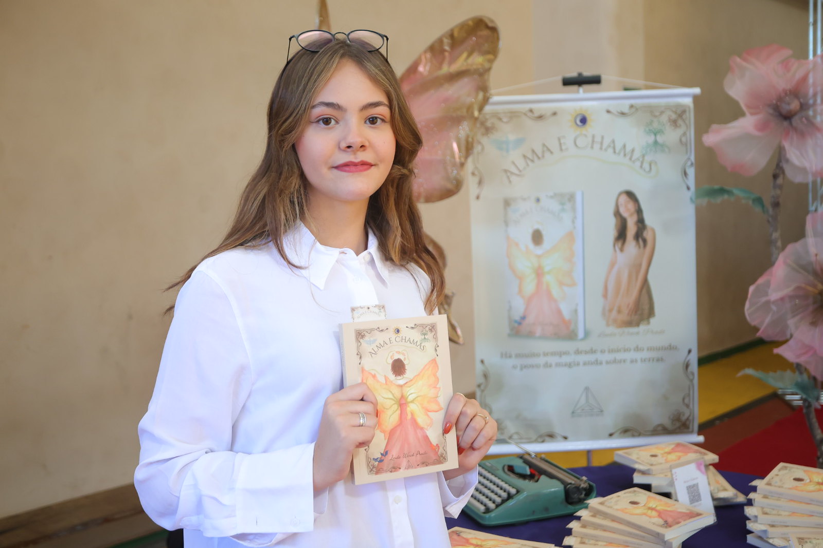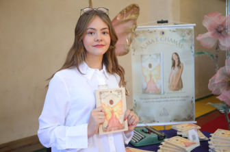 Entre os jovens que já trilham caminhos mais longos dentro do empreendedorismo escolar está Linda Winck Prado, 15 anos, hoje aluna do 9º ano. Ela já participou do JEPP em outras edições e aproveitou a feira deste ano para lançar seu livro “Almas e Chamas”, obra que começou a escrever aos 13 anos.