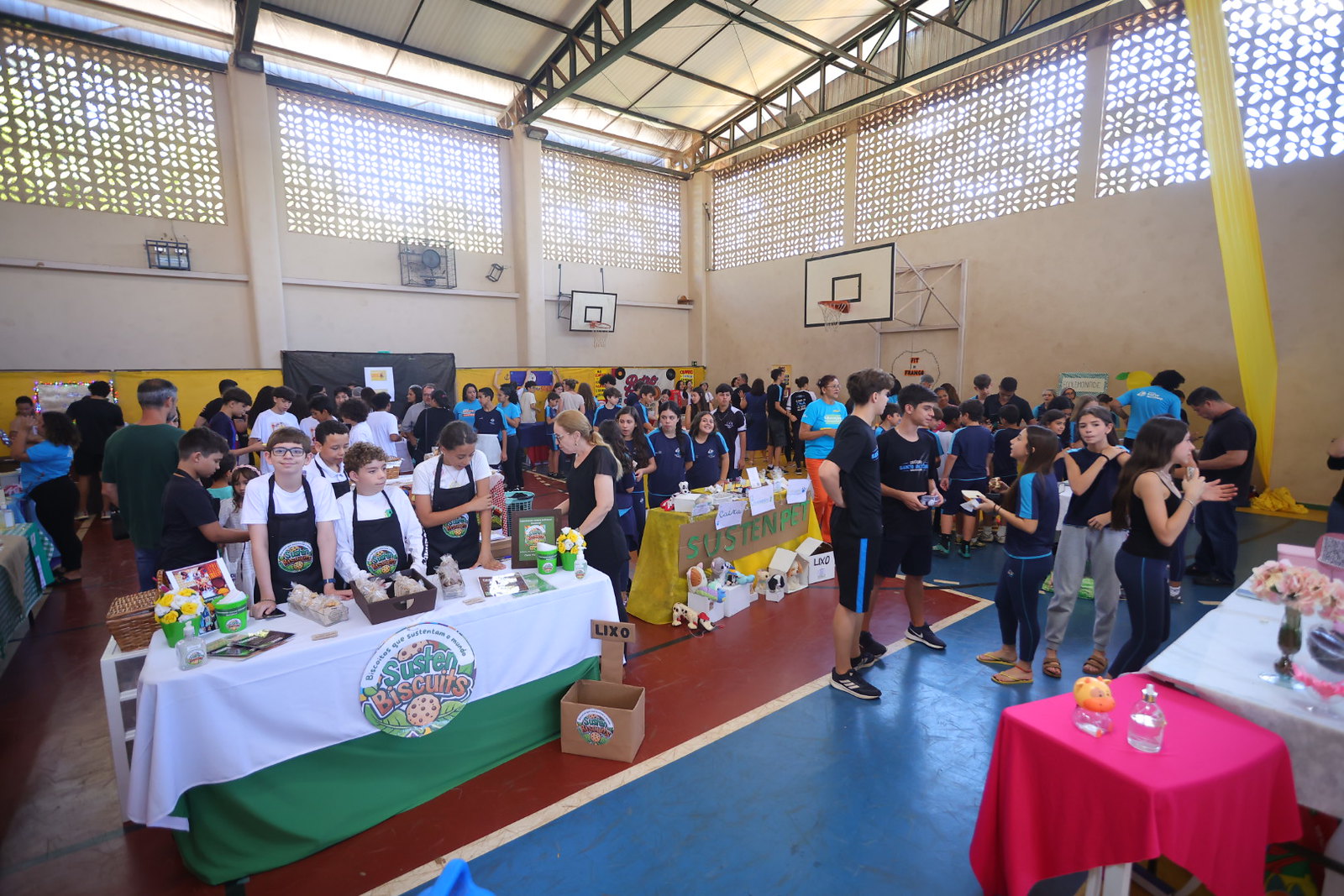 Entre os projetos desenvolvidos pelo 6º ano, esteve a Sustenpet, loja criada por um dos grupos para apresentar produtos sustentáveis voltados a animais domésticos. A aluna Júlia Ledes, de 11 anos, explicou que a ideia foi trabalhar soluções criativas, ecológicas e acessíveis.