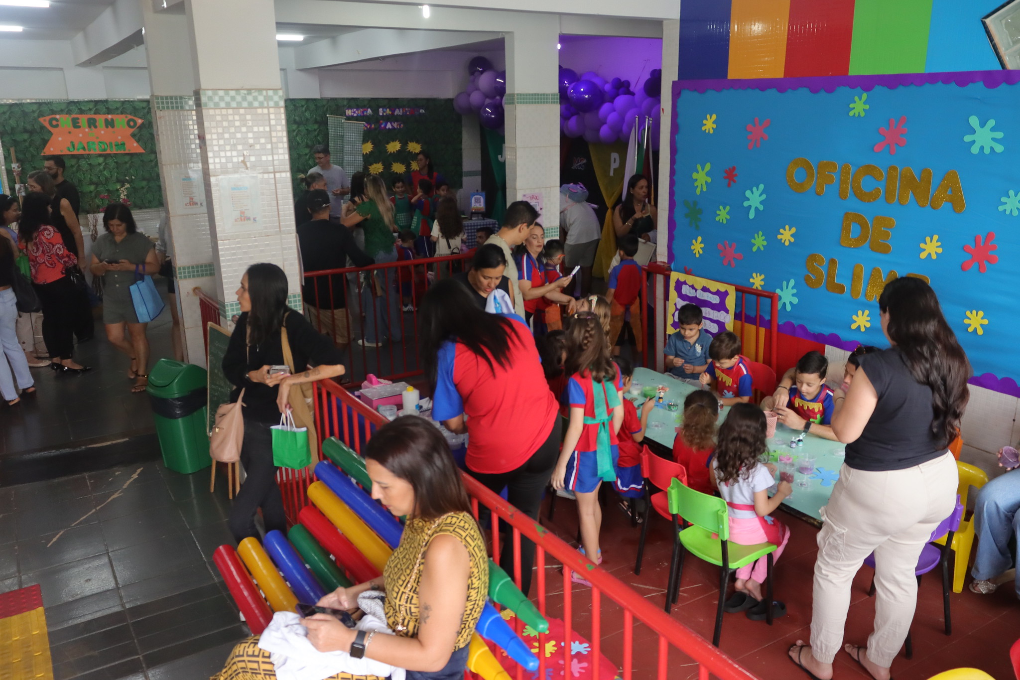 Embora o programa tradicionalmente atenda estudantes a partir do 1º ano do ensino fundamental, o colégio ampliou a proposta desde 2024, incluindo os pequenos da Educação Infantil. Nesta edição, as turmas do Maternal e Pré-escolar encantaram as famílias com panos de prato personalizados e uma animada oficina de slime.