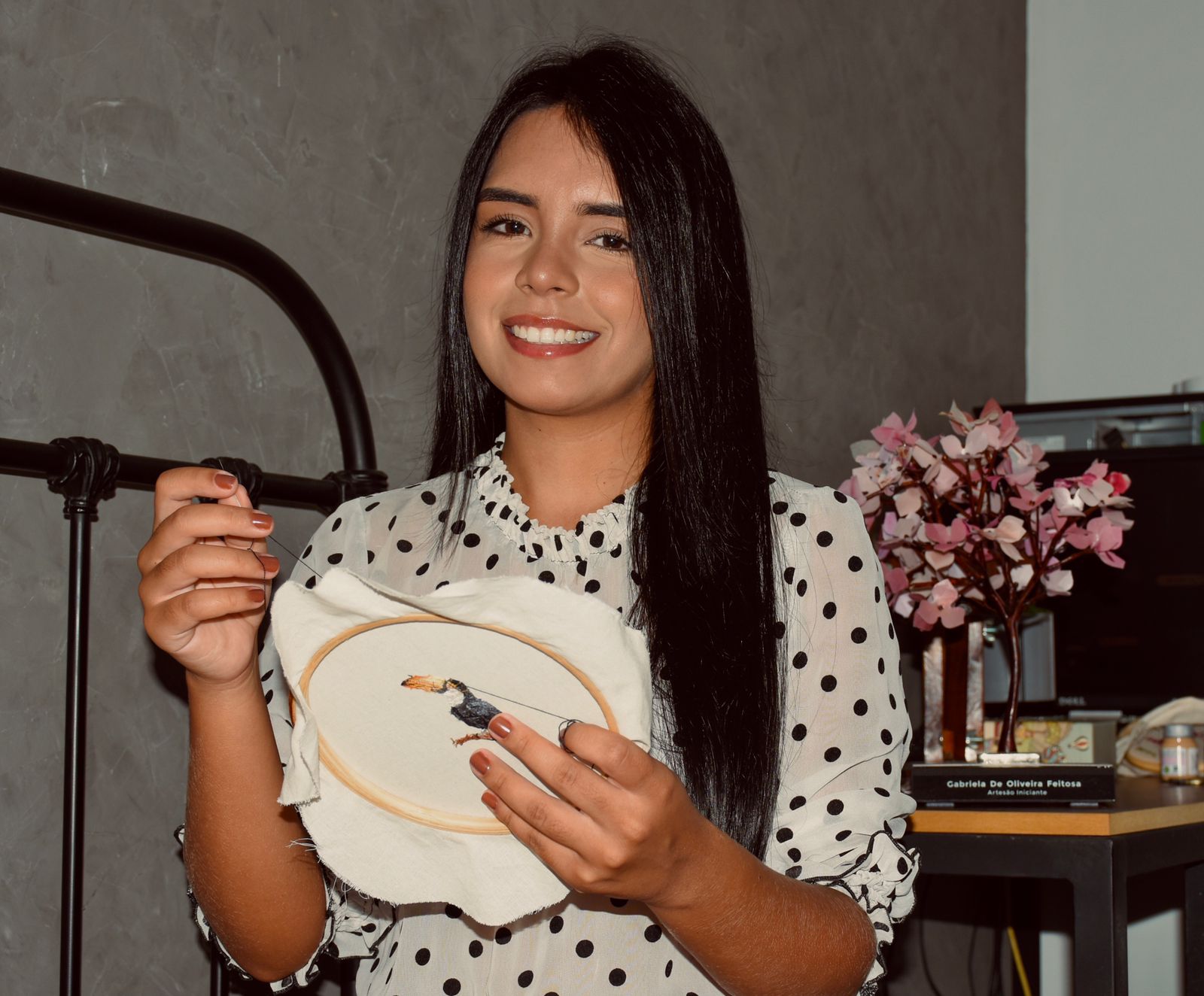 Foi em sua infância, por volta dos 10 anos de idade, que a brasiliense Gabriela Feitosa começou a compreender e se familiarizar com o extenso universo do artesanato. A jovem, hoje com 21 anos, costumava observar a mãe, uma artesã de mão cheia especializada na confecção de peças em crochê. Esse hábito serviu de inspiração para Gabriela, que rapidamente aprendeu a pintar, fazer crochê, tricô e também a se aventurar na arte do bordado.