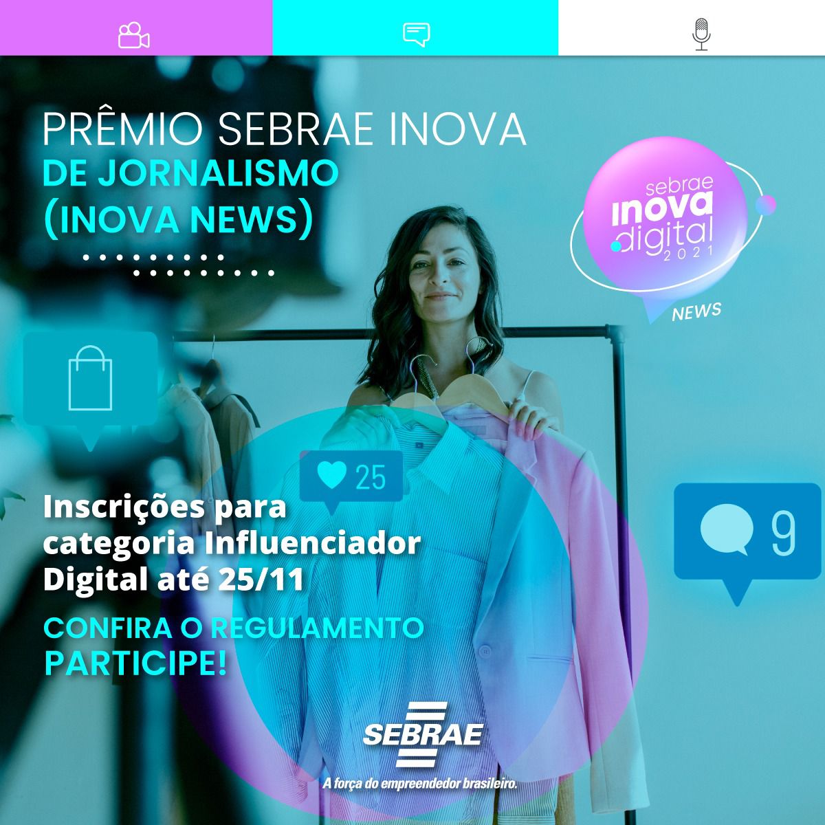 Influenciadores digitais que se destacam na divulgação de temas relacionados à inovação e empreendedorismo e que tenham no mínimo 10 mil seguidores ainda podem se inscrever na 1ª edição do Prêmio Sebrae Inova de Jornalismo (Sebrae Inova News). O prazo para inscrições termina na próxima quinta-feira, 25 de novembro.
