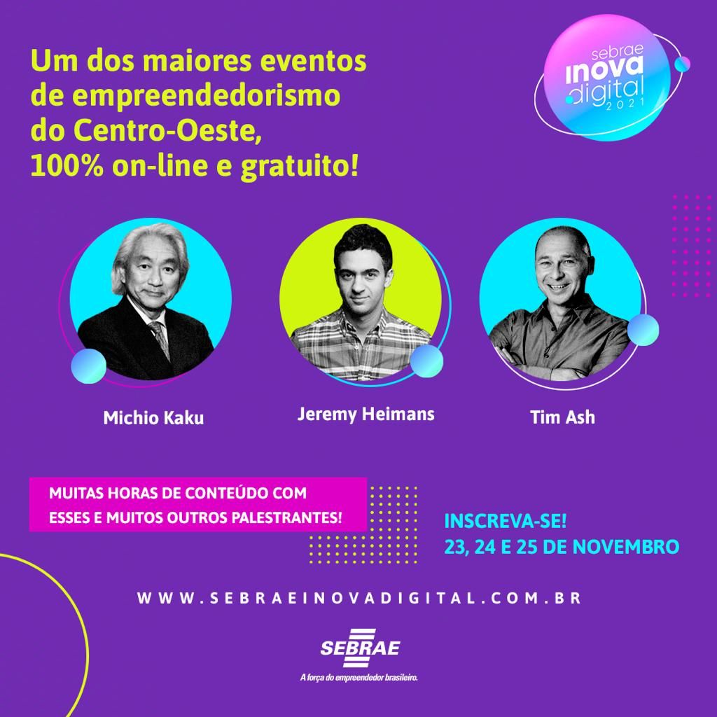 Nos dias 23, 24 e 25 de novembro o Sebrae no Distrito Federal promove a mais nova edição do Sebrae Inova Digital. O evento, que tem o objetivo de inspirar micro e pequenos empresários, potenciais empreendedores e também interessados em abrir o próprio negócio ou em desenvolver suas carreiras, ocorrerá de forma online e gratuita e com a participação de referências nacionais e internacionais em empreendedorismo, inovação e tecnologia. As inscrições para participar da realização podem ser feitas por meio do site www.sebraeinovadigital.com.br.