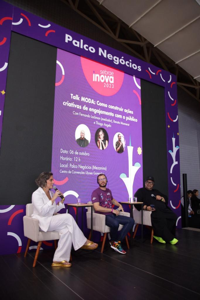Em seguida, o palco apresentou o “Talk Moda: como construir ações criativas de engajamento com o público”, um bate-papo descontraído com Fernando Lackman, Renata Monnerat e Thiago Angelo falando sobre moda, ações criativas, mostrando para o pequeno empresário que é possível utilizar essas estratégias a partir da sua realidade e trajetória e alcançar novos clientes.