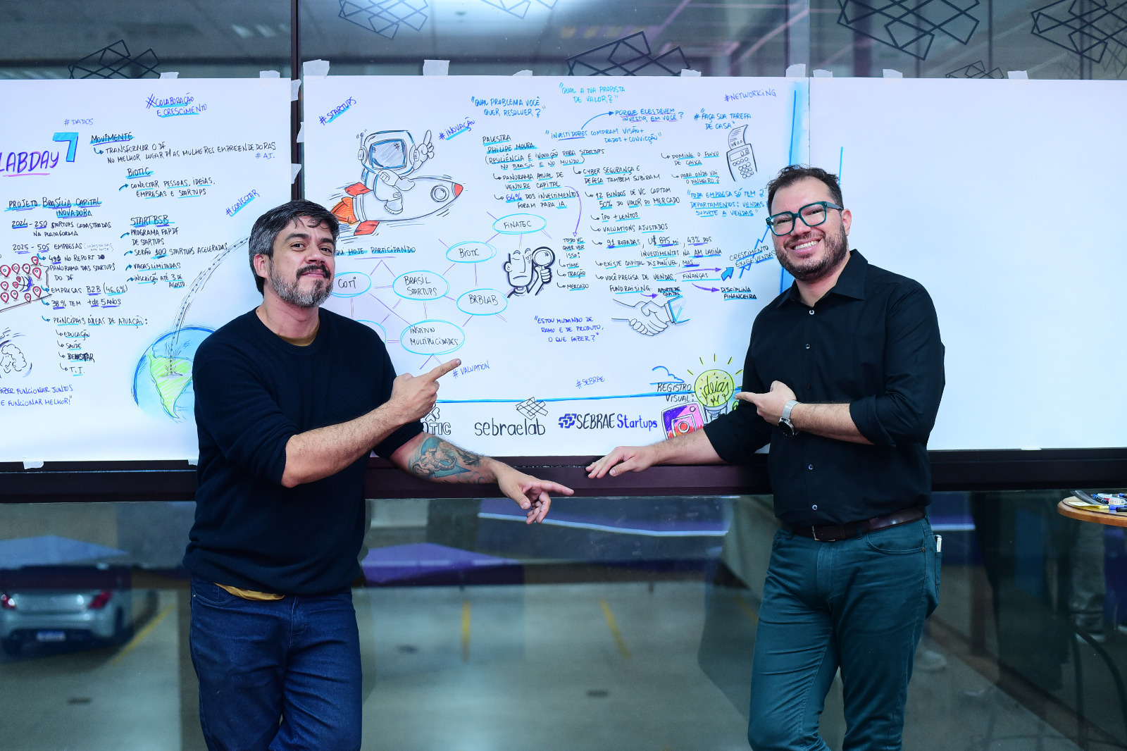O conteúdo foi registrado em tempo real por meio de painéis gráficos ilustrados, produzidos pelo facilitador Bruno Tavares, que há 11 anos trabalha com facilitação gráfica no DF e transmitiu a mensagem do encontro em elementos visuais que integraram a proposta visual e interativa do LabDay.